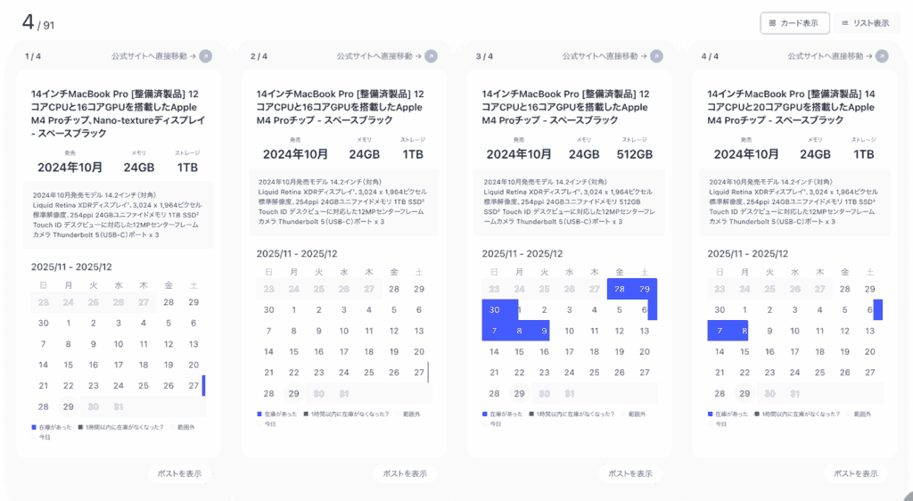 アップルストア整備済製品 在庫履歴というサイトがあり、商品ごとに過去の在庫履歴を確認することができます。