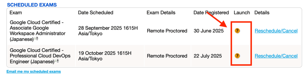 試験開始時刻の約10分前になると、WebassessorのSCHEDULED EXAMSの「?」のところに「Launch」ボタンが表示されます。
