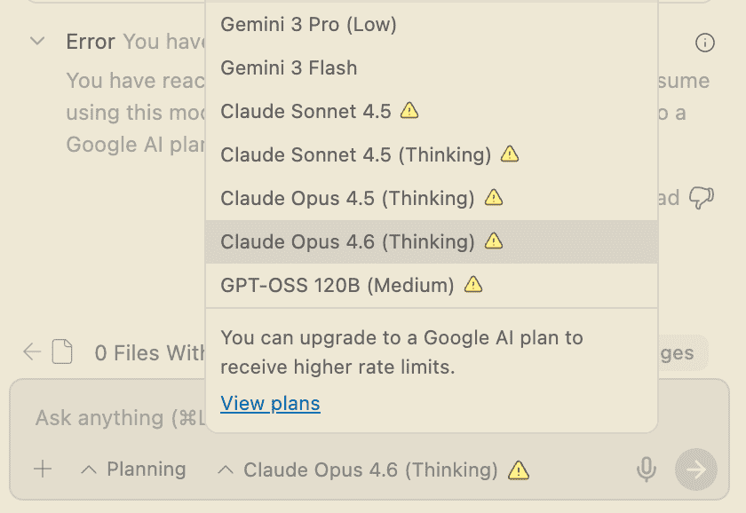 Claude Opus 4.6 (Thinking)を使って1時間くらいアプリ開発をした時点でQuota Limitに達してしましました。