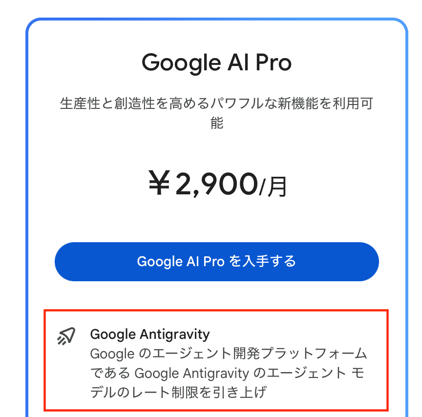 AI エージェントへの割り当て量の増加: AI Pro メンバーは、Google Antigravity プラットフォーム内の Gemini 3 Pro やその他の Vertex AI Model Garden モデル(Claude 4.5 Sonnet、gpt-oss-120b など)の使用量上限が引き上げられます(この上限は 5 時間ごとに更新されます)。また、AI Pro メンバーは、リソースが許す限り、新しい試験運用版モデルへの優先アクセスが可能です。